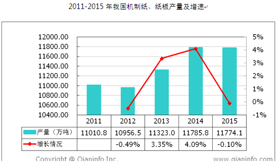 2011年我国机制纸、纸板产量达11010.89万吨;2012年10956.54万吨,同比下降0.49%;2013年产量11323.06万吨,同比增长3.35%;2014年11785.80万吨,同比增长4.09%;2015年11774.10万吨,同比下降0.10%。而在2016年一季度,产量达2840.6万吨,同比增长5.57%,又出现大幅度增长。总的来说产量仍呈现增长趋势,增速出现小幅度波动。