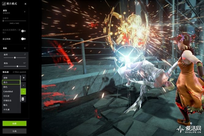 上述功能并非Ansel的完全体,在GeForce Experience 3.12版本以后追加的滤镜不仅更多,还可以根据需求调整滤镜的叠加顺序,现场截图现场P图,完全一气呵成。同样是之前铁拳7的游戏照片,如果想给图片加入一些艺术风格并突出重点,可以分别添加景深过滤部分背景元素,通过花饰图案、半色调突出中心人物,在通过颜色滤镜调节整个画面对比度,让原本纯粹的游戏照片得到进一步。